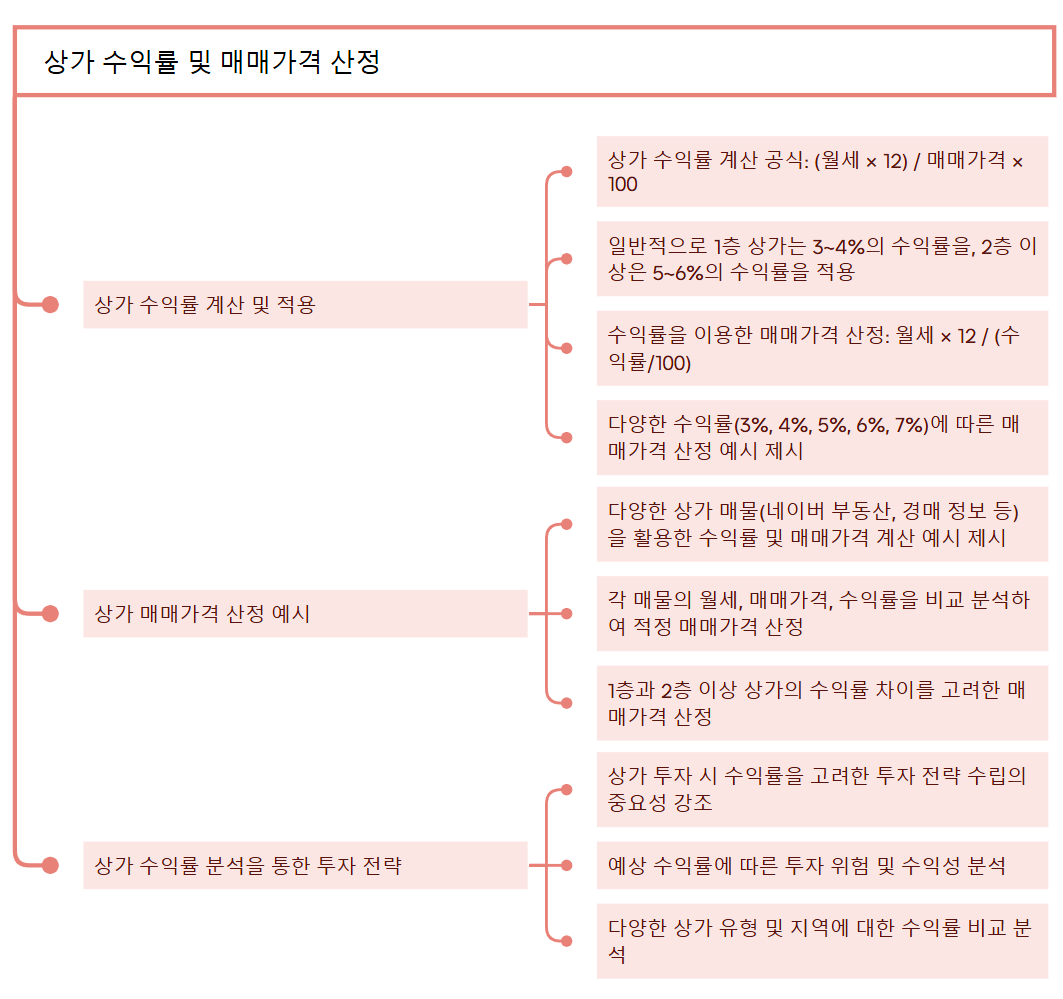 | 수익률 공식, 수익률별 가격 산정 예시 | 층수·면적에 따른 업종 추천 및 가격 분석 | 사례 기반 투자 전략 및 리스크 분석 |
