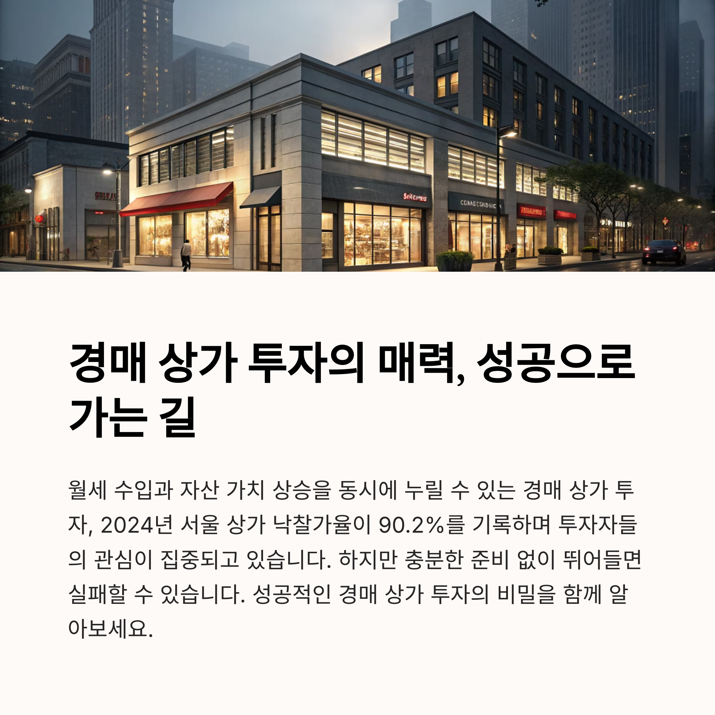 - 다양한 투자 전략: 상가 유형, 입지, 임대 조건 등에 따라 다양한 투자 전략을 구사할 수 있습니다.