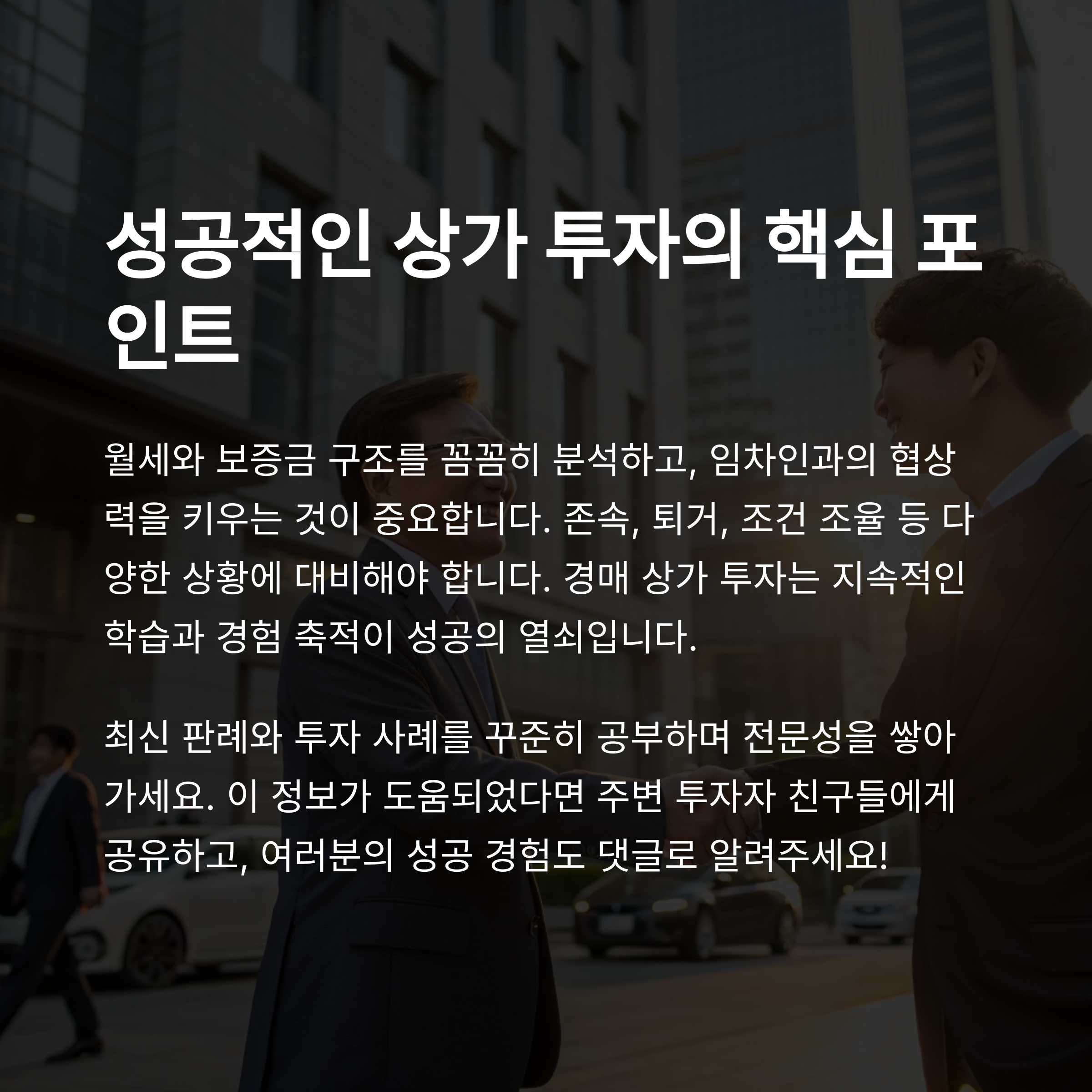 철저한 권리 분석을 바탕으로, 다음과 같은 투자 전략을 고려한다면 성공적인 경매 상가 투자를 이룰 수 있습니다.
