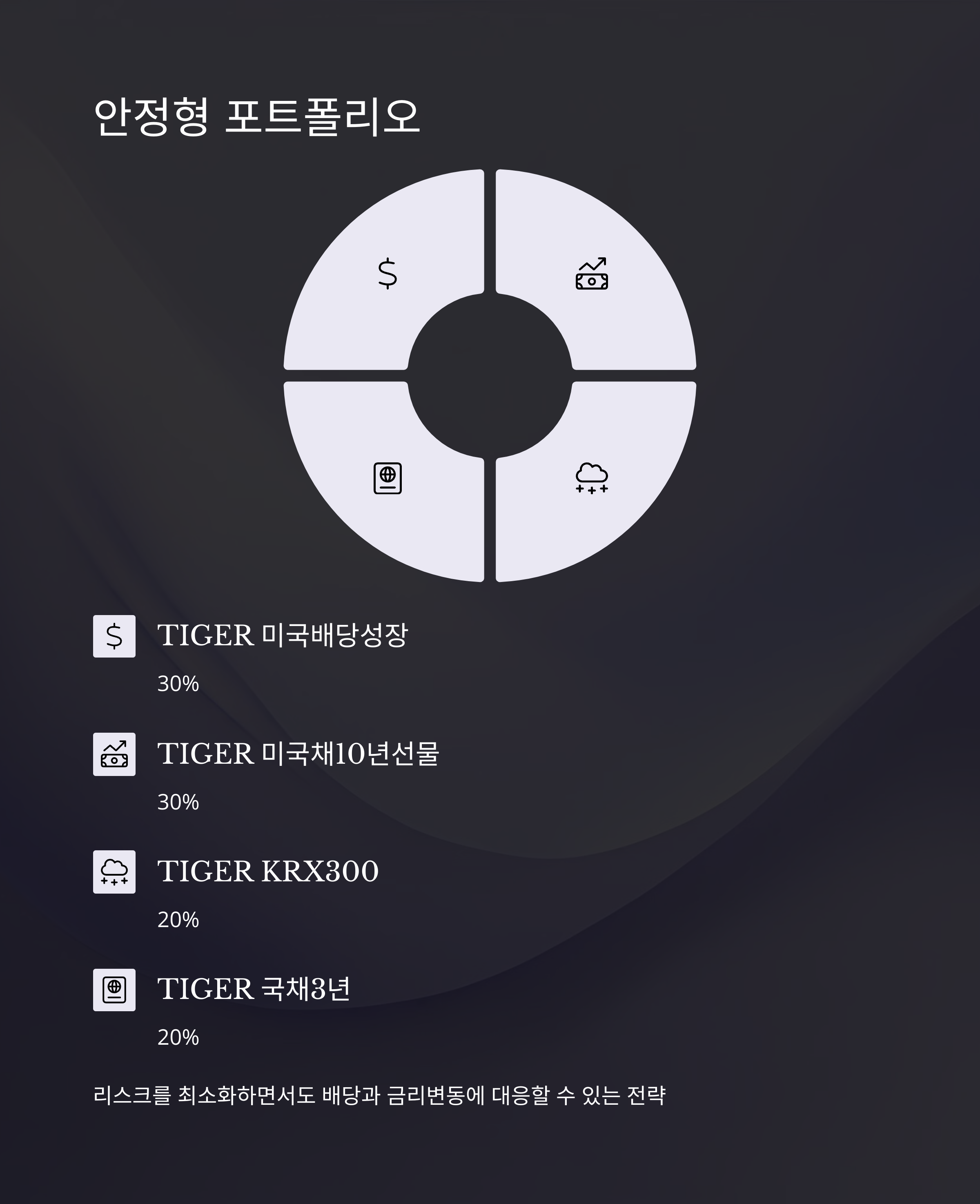 다음은 TIGER ETF를 활용한 대표적인 안정형 포트폴리오 예시입니다.